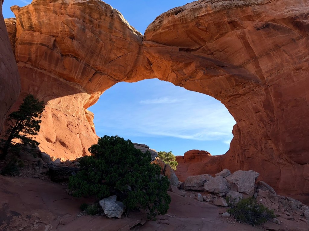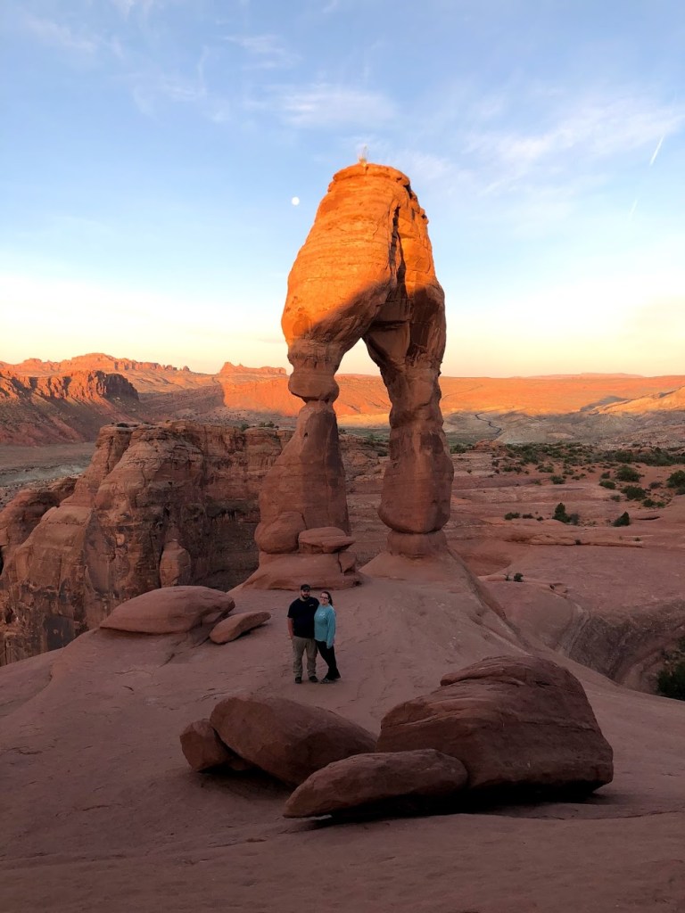 We woke up between 3-4 a.m. to get to the trail before sunrise and hiked under the light of a bright full moon. We may have taken the “scenic route” on this trail since we could not see all of the markers. After a pretty short hike we arrived at Delicate Arch just before sunrise and we were lucky to have a few moments of solitude before it was flooded with people.